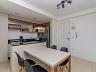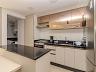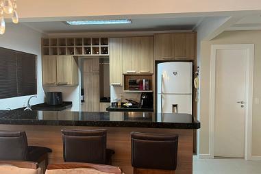 • Cozinha equipada com geladeira, fogão e móveis sob medida.