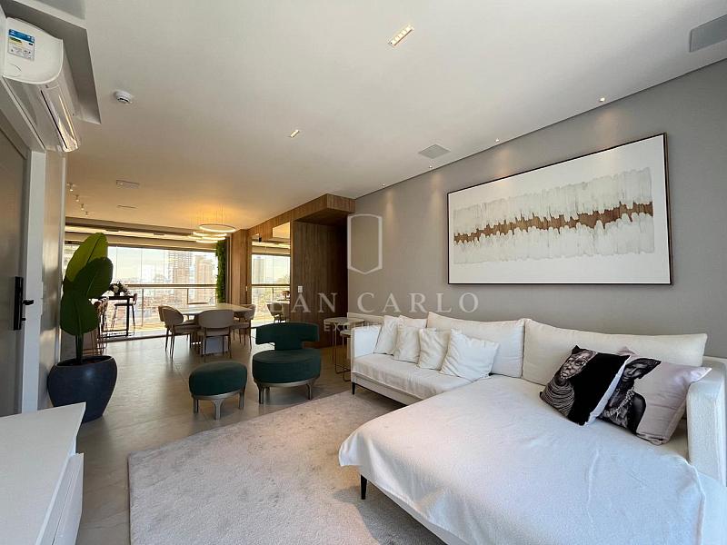 Apartamento amplo com 132m² de área privativa, 3 suítes, lavabo, área de serviço independente, sala de estar, sala de jantar conjugada com a cozinha, sacada com churrasqueira à carvão e fechamento em reiki. Acompanham o apartamento 3 vagas de garagem e 1 hobby box.