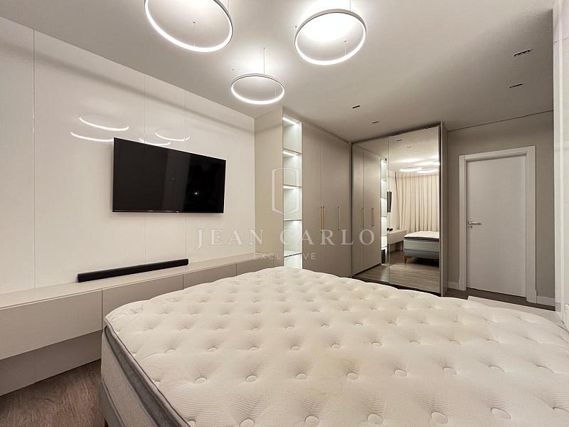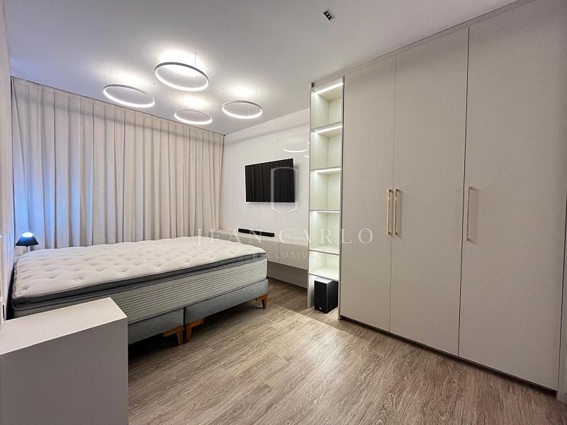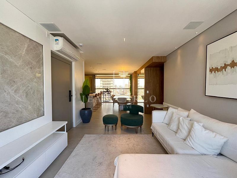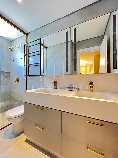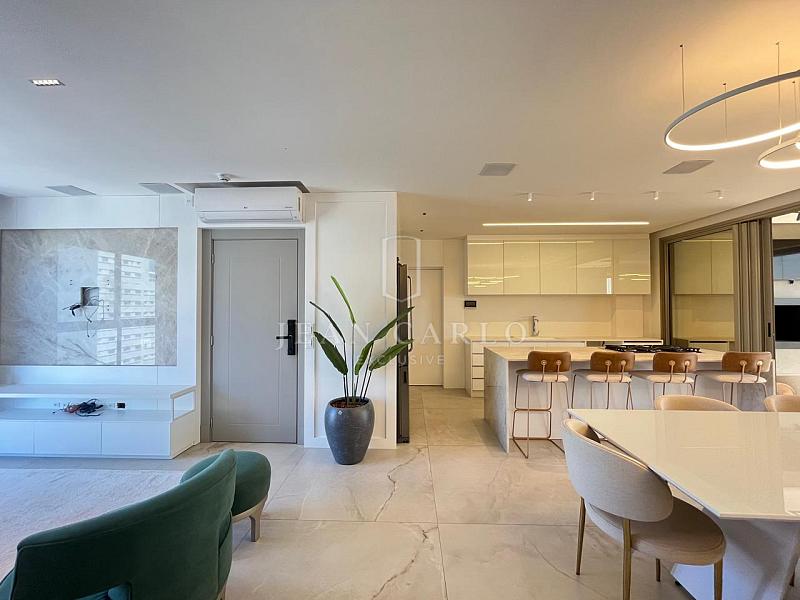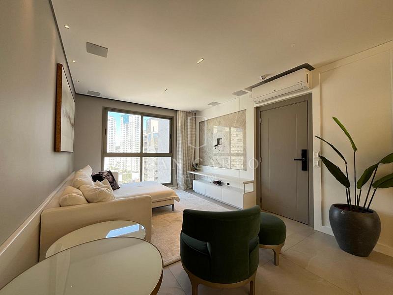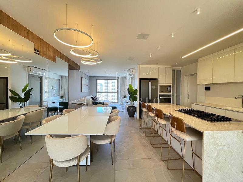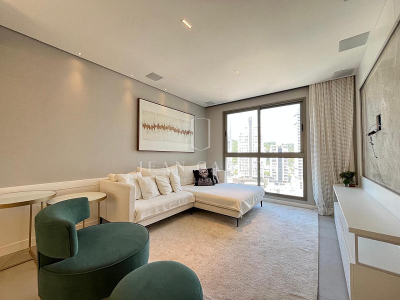 O apartamento está finamente mobiliado, decorado e equipado, com móveis planejados em todos os ambientes, piso em porcelanato nas áreas sociais e molhadas e vinílico nos dormitórios. Ficam todos os elétros, móveis fixos e soltos, tapetes, cortinas e persianas (que inclusive são automatizadas) e ar condicionados instalados.