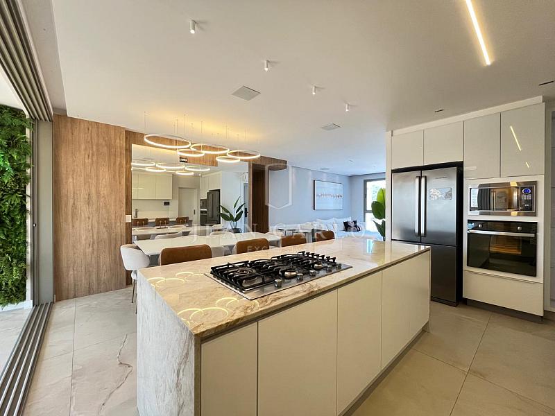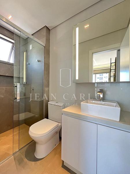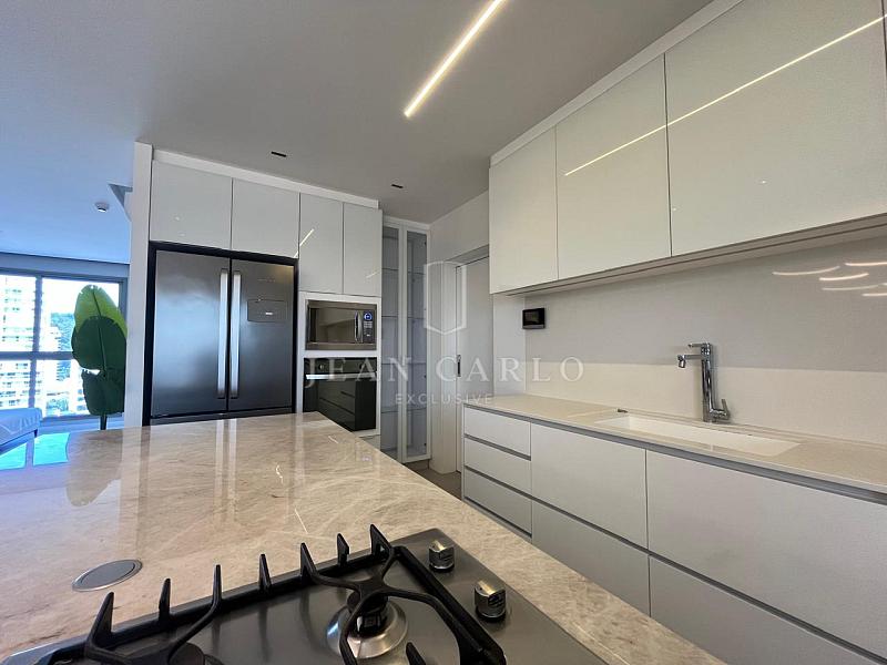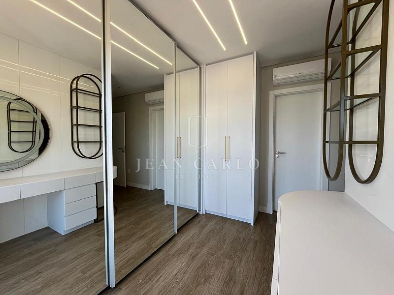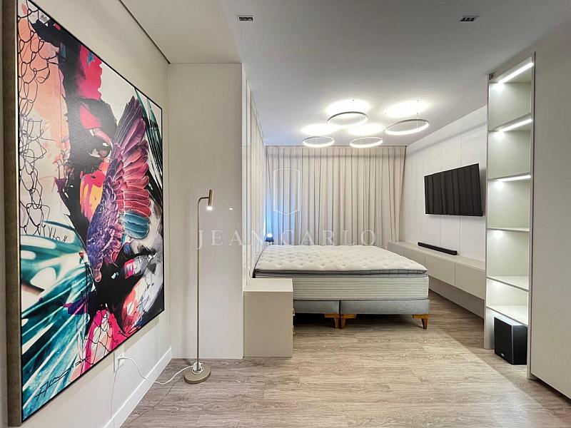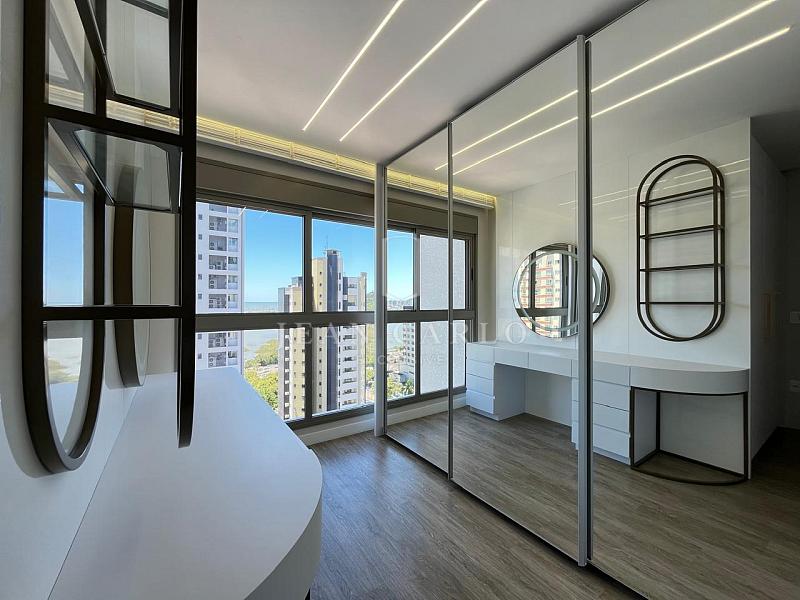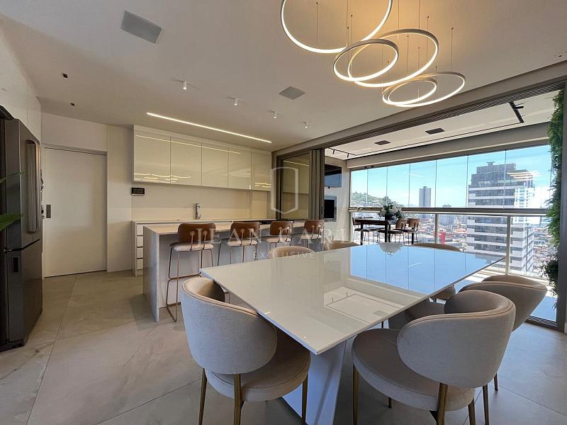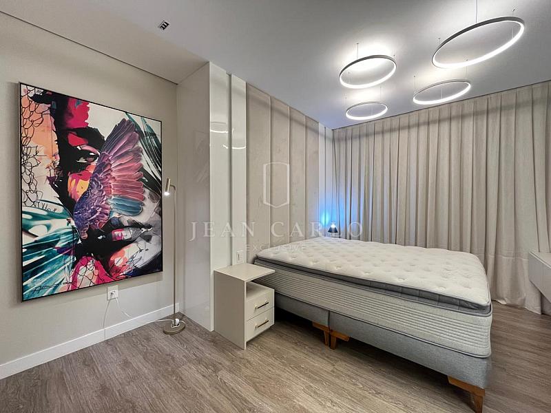O apartamento está finamente mobiliado, decorado e equipado, com móveis planejados em todos os ambientes, piso em porcelanato nas áreas sociais e molhadas e vinílico nos dormitórios. Ficam todos os elétros, móveis fixos e soltos, tapetes, cortinas e persianas (que inclusive são automatizadas) e ar condicionados instalados.