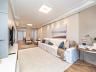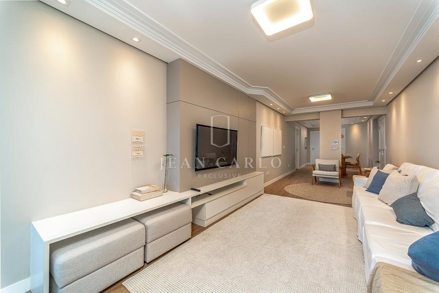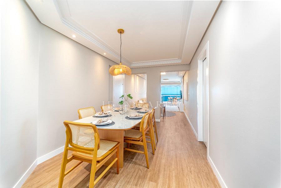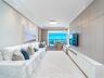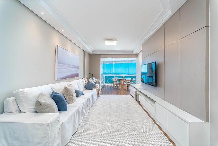 A sala de estar transmite conforto e elegância, com móveis sofisticados e uma decoração clean que valoriza cada detalhe. O espaço se conecta harmoniosamente com a varanda envidraçada, que proporciona uma vista incrível para o mar — um verdadeiro espetáculo que transforma cada momento em uma experiência única.