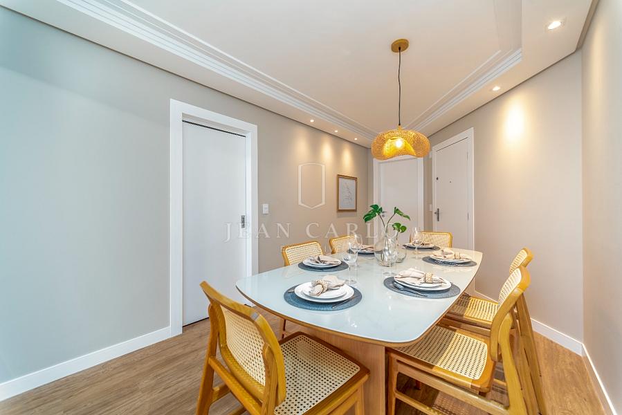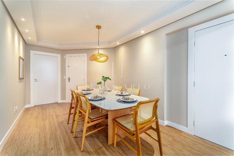 A sala de jantar é acolhedora e bem iluminada, perfeita para desfrutar de refeições especiais com a sensação de estar sobre o oceano. A integração dos ambientes é fluida, ampliando a sensação de amplitude e sofisticação.