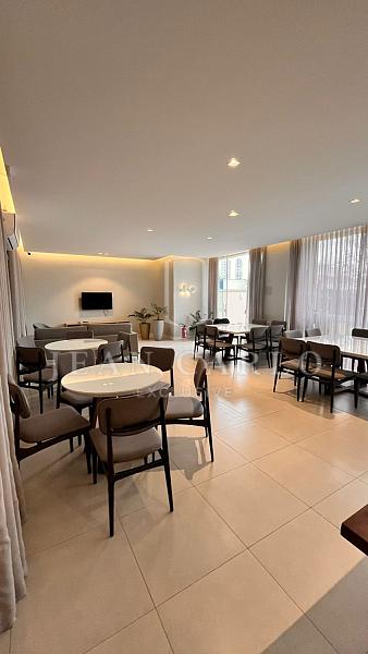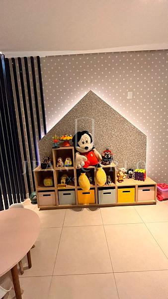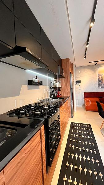 • Cozinha e sala integrados (fica móveis sob medida, incluindo mesa e cadeiras, sofá e eletrodomésticos, sendo geladeira, máquina de lavar roupa e microondas);