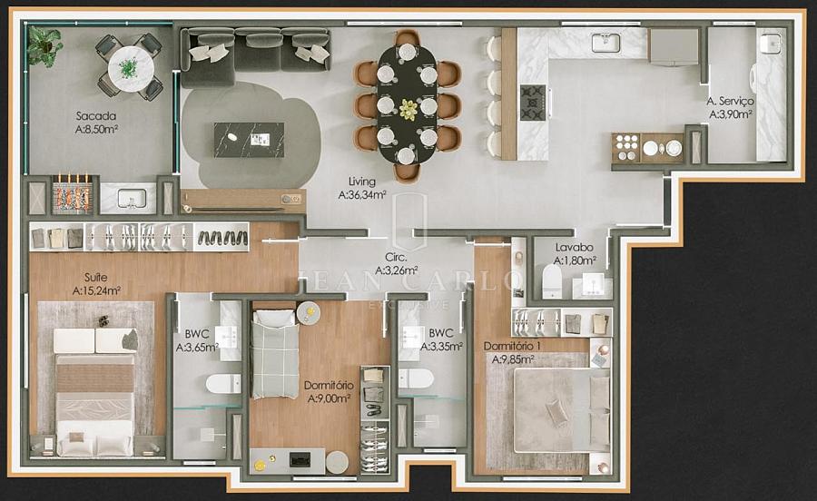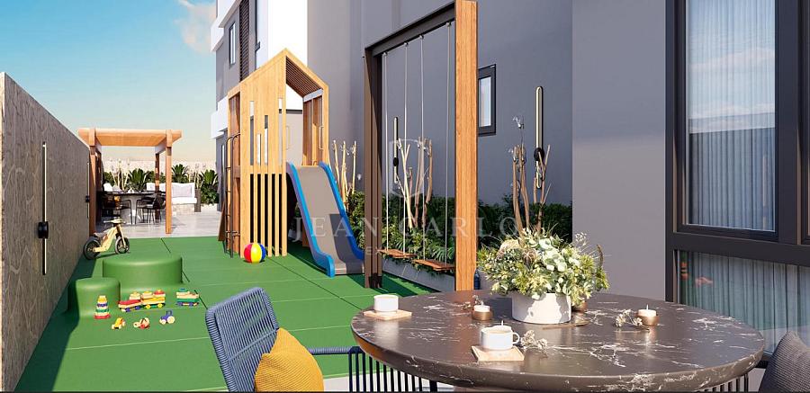 Com uma área privativa de 109,72m², o apartamento conta com 1 suíte, 2 dormitórios, lavabo, área de serviço separada, living com cozinha, sala de estar e jantar, sacada com churrasqueira à carvão e uma sacada na suíte. Acompanham o apartamento 2 vagas de garagens e 1 hobby box. O apartamento será entregue com porcelanato de alto padrão nas áreas sociais e molhadas, vinílicos nas áreas íntimas, infra para ar condicionado split e teto rebaixado em gesso.
