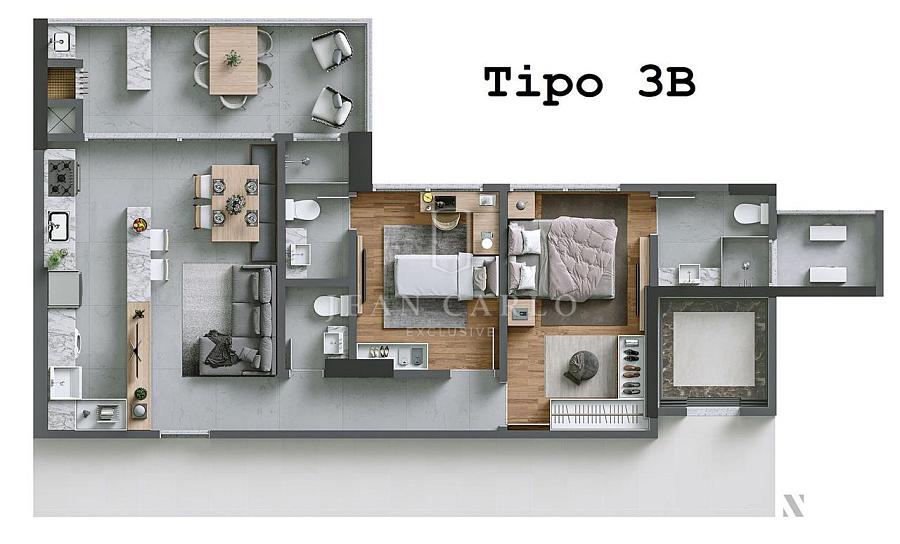 Com 83m² de área privativa, este apartamento possui 2 suítes, lavanderia, cozinha e living integrados, sacada aberta com churrasqueira à carvão. Acompanham o imóvel 2 vagas de garagem.