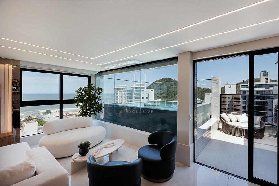 A área externa é um convite ao bem-estar, com um terraço espaçoso, mobiliário moderno e uma vista panorâmica para o mar que transforma qualquer momento em uma experiência única. A sala de estar e jantar, banhadas por luz natural, revelam um projeto de interiores impecável, com tons suaves, acabamentos refinados e uma harmonia perfeita entre luxo e aconchego.