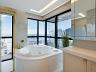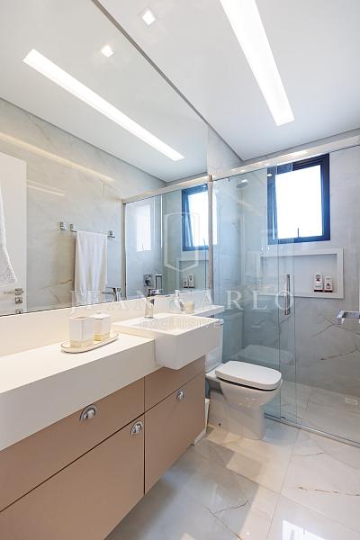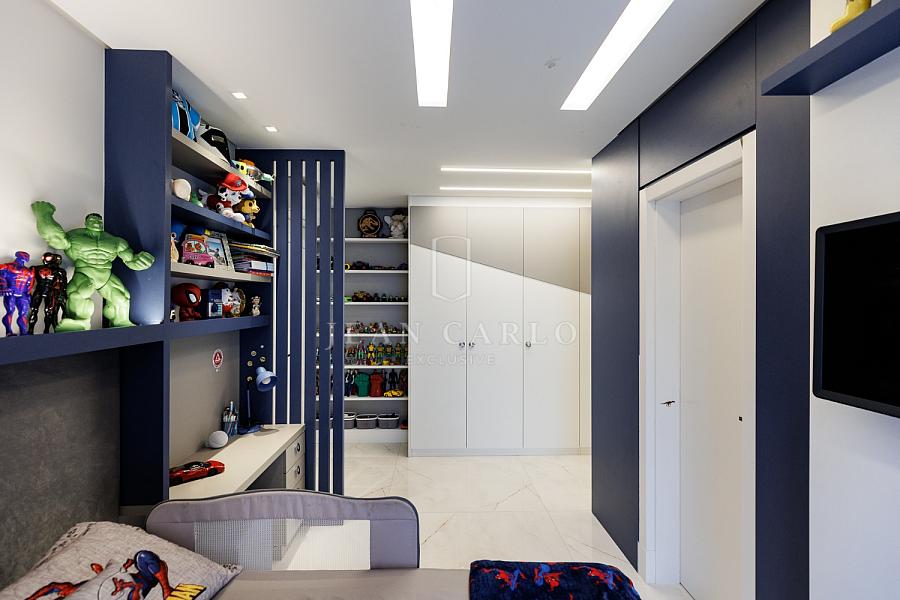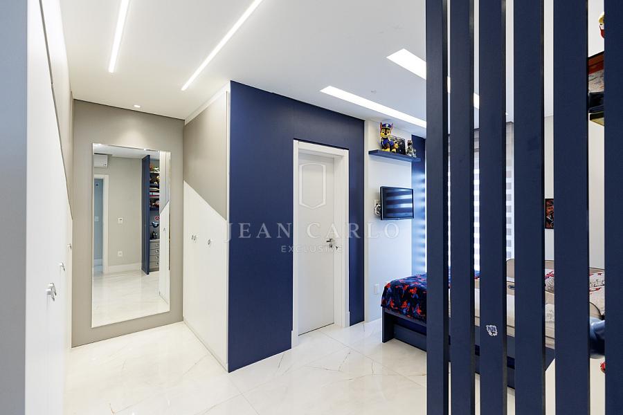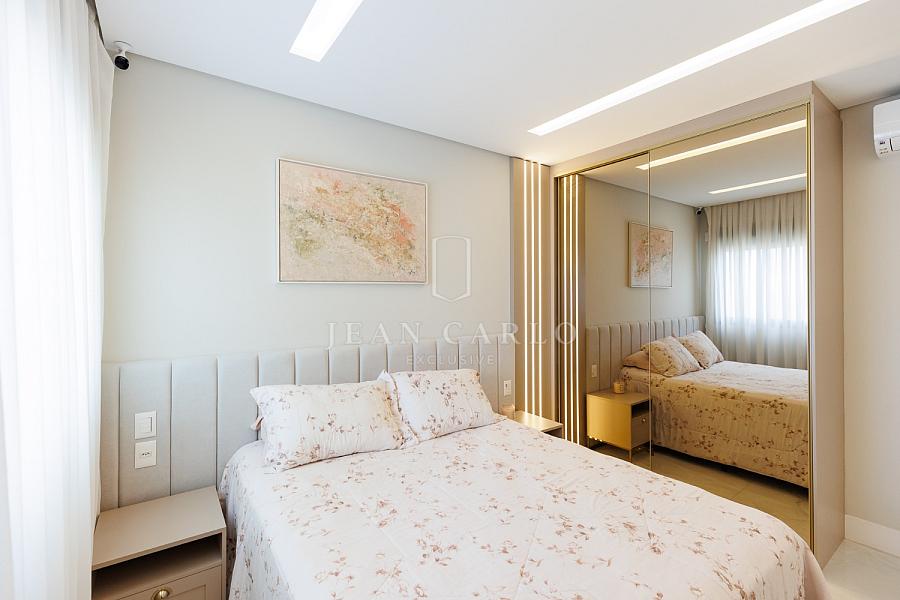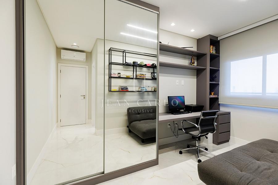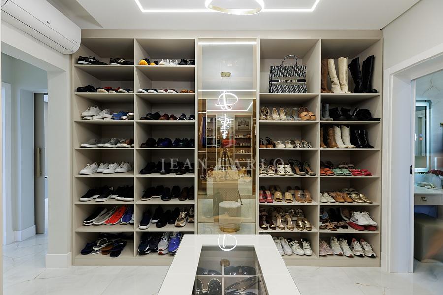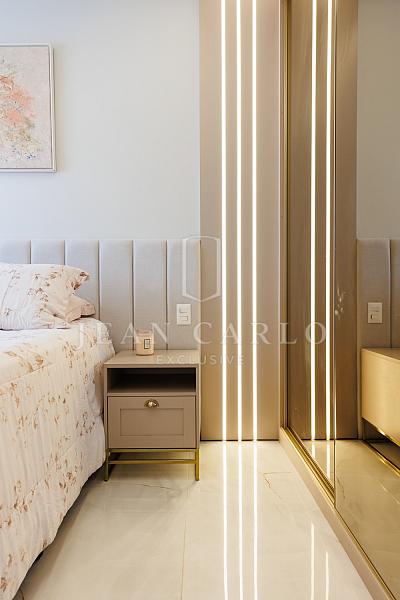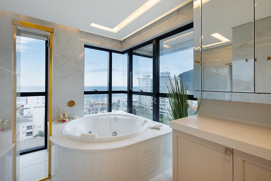 O quarto principal é puro conforto e exclusividade, com iluminação intimista e um design que transmite serenidade. O banheiro, com hidromassagem e vista para o oceano, é um verdadeiro spa particular. E o closet... um sonho à parte — espaçoso, funcional e com acabamento impecável.